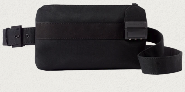 The clean, stylish and functional pouch can be worn belted or cross-body with a twist: a buckled clasp with an elevated design finish that doubles as a security barrier with a 3-digit combination code which functions as a portable safe.